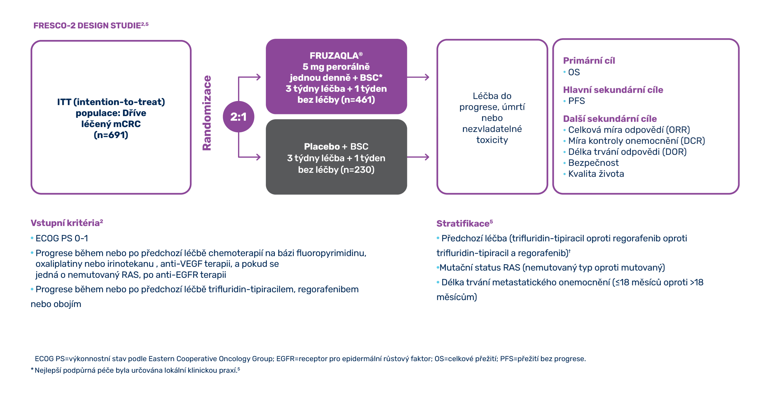 FRESCO-2 je mezinárodní, randomizovaná, dvojitě zaslepená, multicentrická studie fáze 3, která hodnotí účinnost a bezpečnost přípravku FRUZAQLA® s nejlepší podpůrnou péčí (BSC) oproti placebu s BSC2,5.