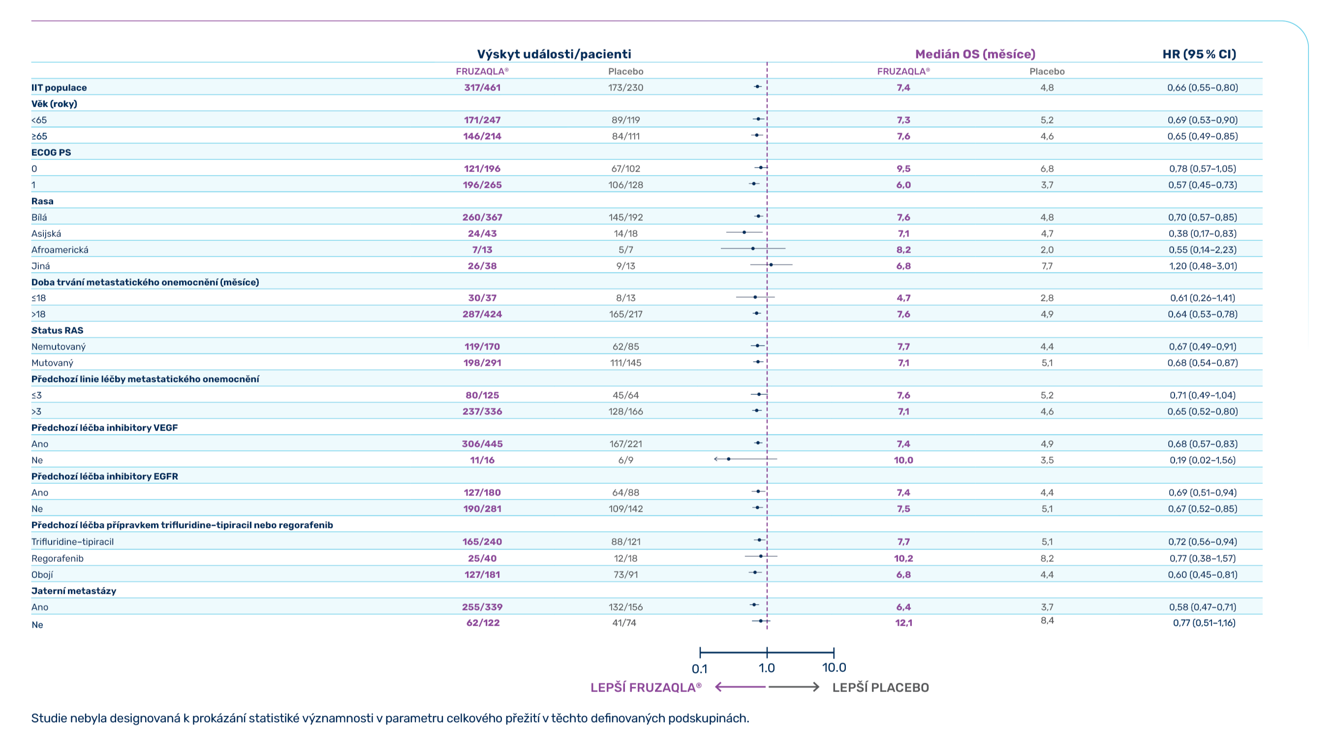 Benefit přípravku FRUZAQLA® v celkovém přežití byl konzistentní ve všech definovaných podskupinách bez ohledu na dobu trvání metastatického onemocnění, status RAS, předchozí typy léčby a přítomnost jaterních metastáz5: